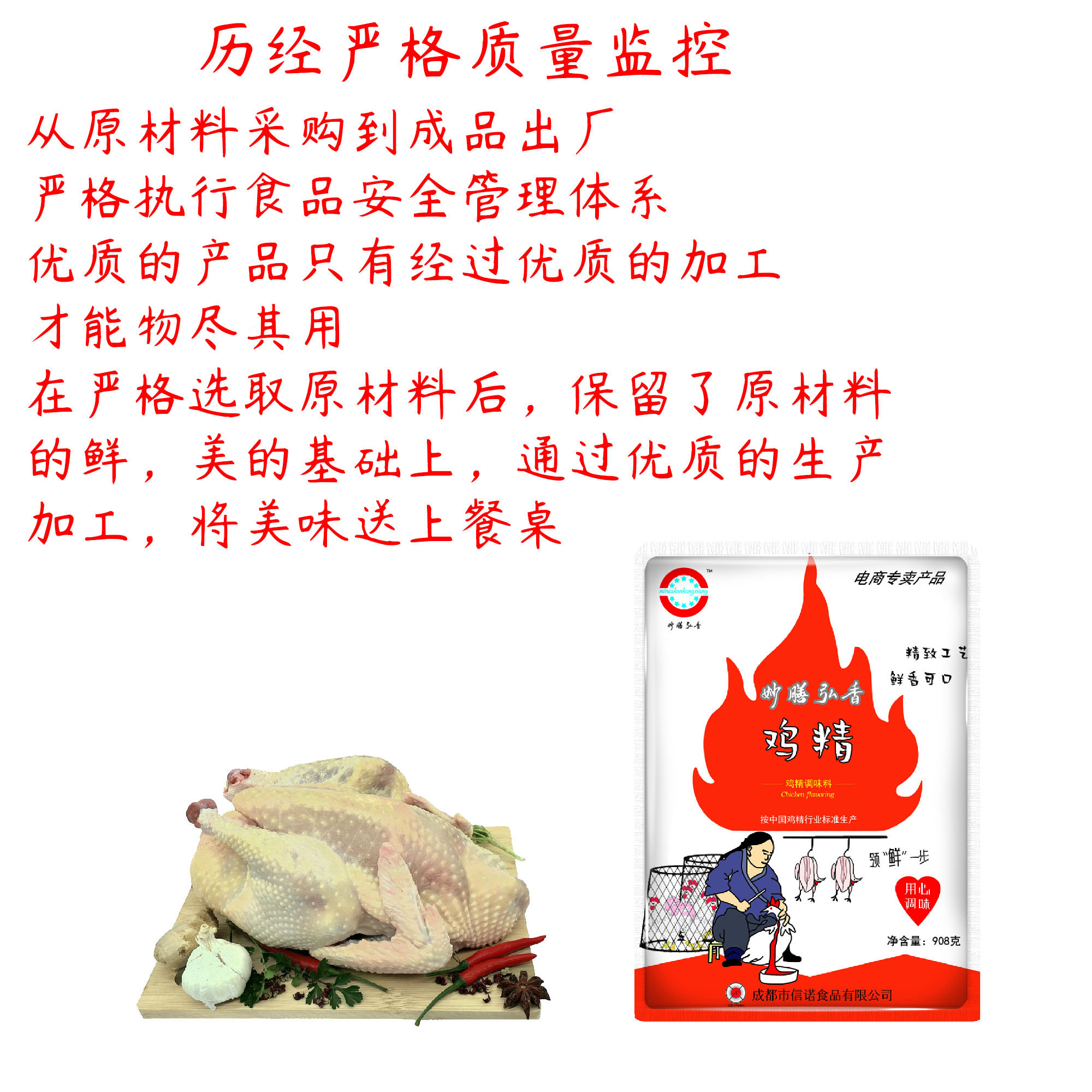 908克妙膳弘香鸡精达到国家标准,精致工艺,价格实惠,促销力度大,是本公司性价比之王,适合各式菜肴,连绪二年是本公司销量之王